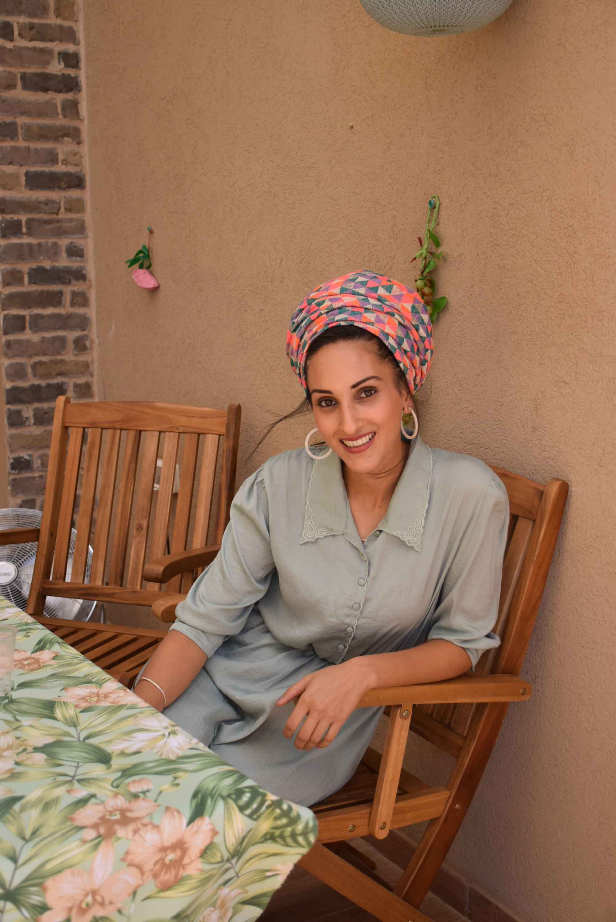 שמלה: הודיה לוביץ, מטפחת : אביה ששון. / שמלה: גולדה, מטפחת: נחלת בנימין, עגילים: שדה בר /שמלה שדה בר, מטפחת: אתכסיא .