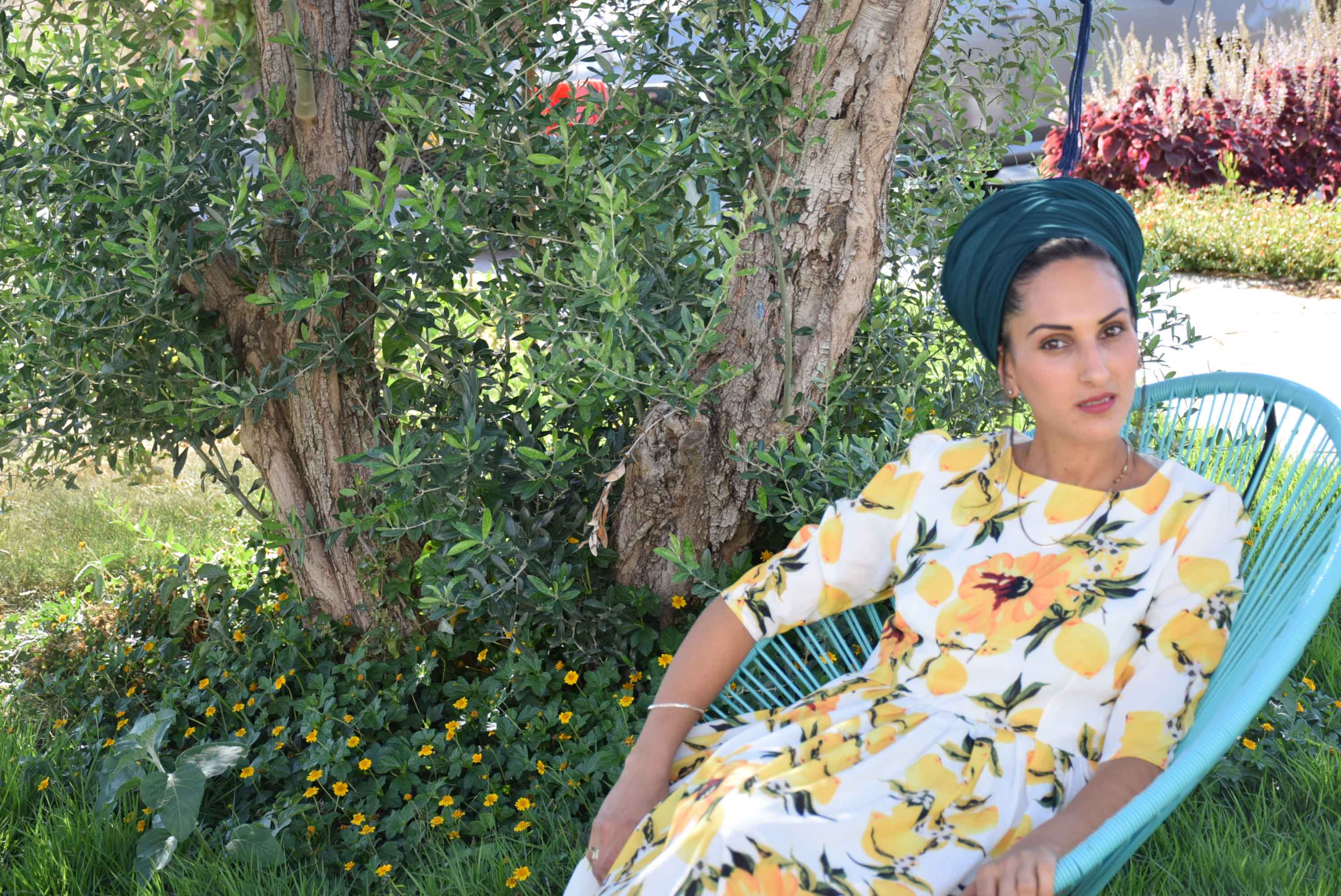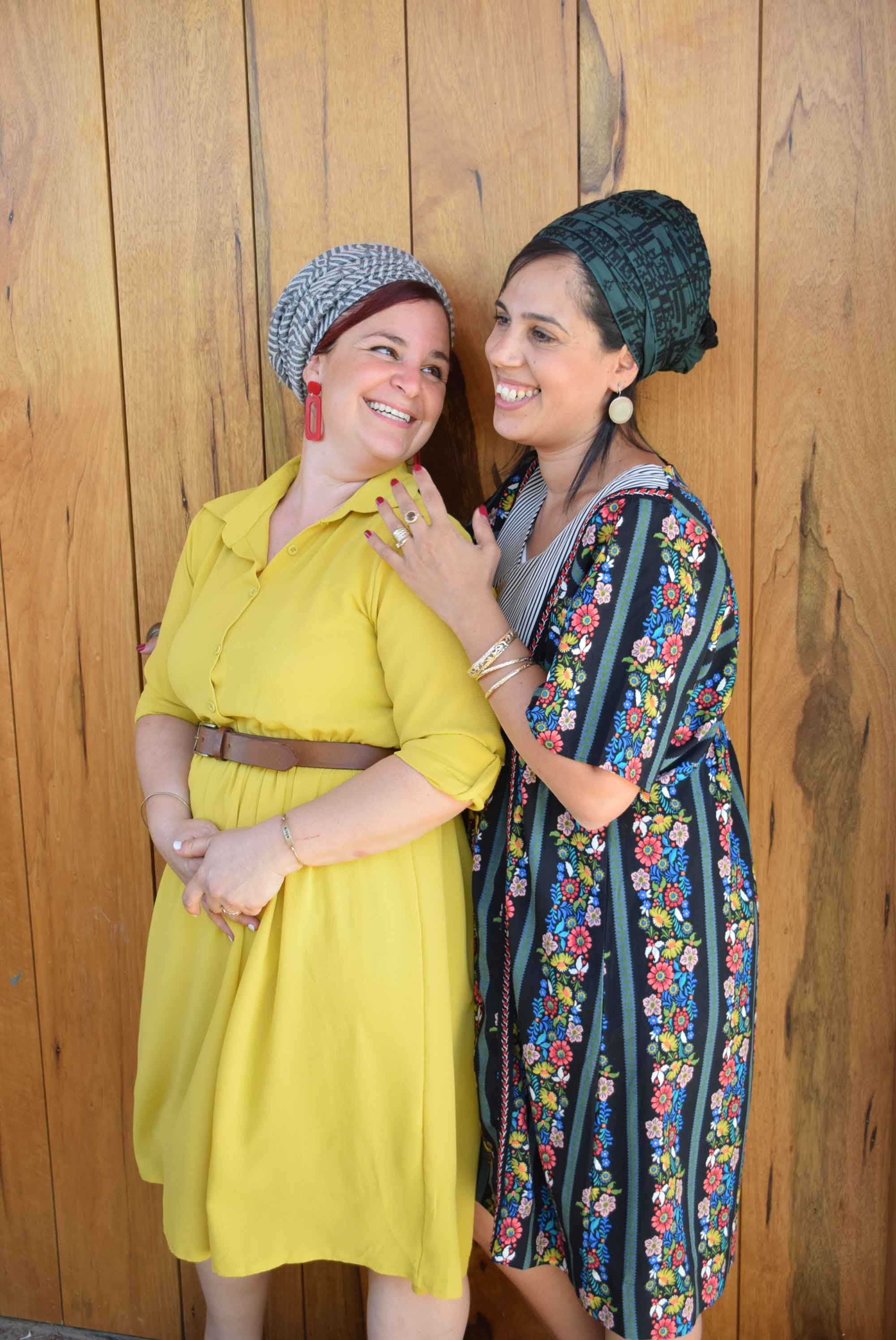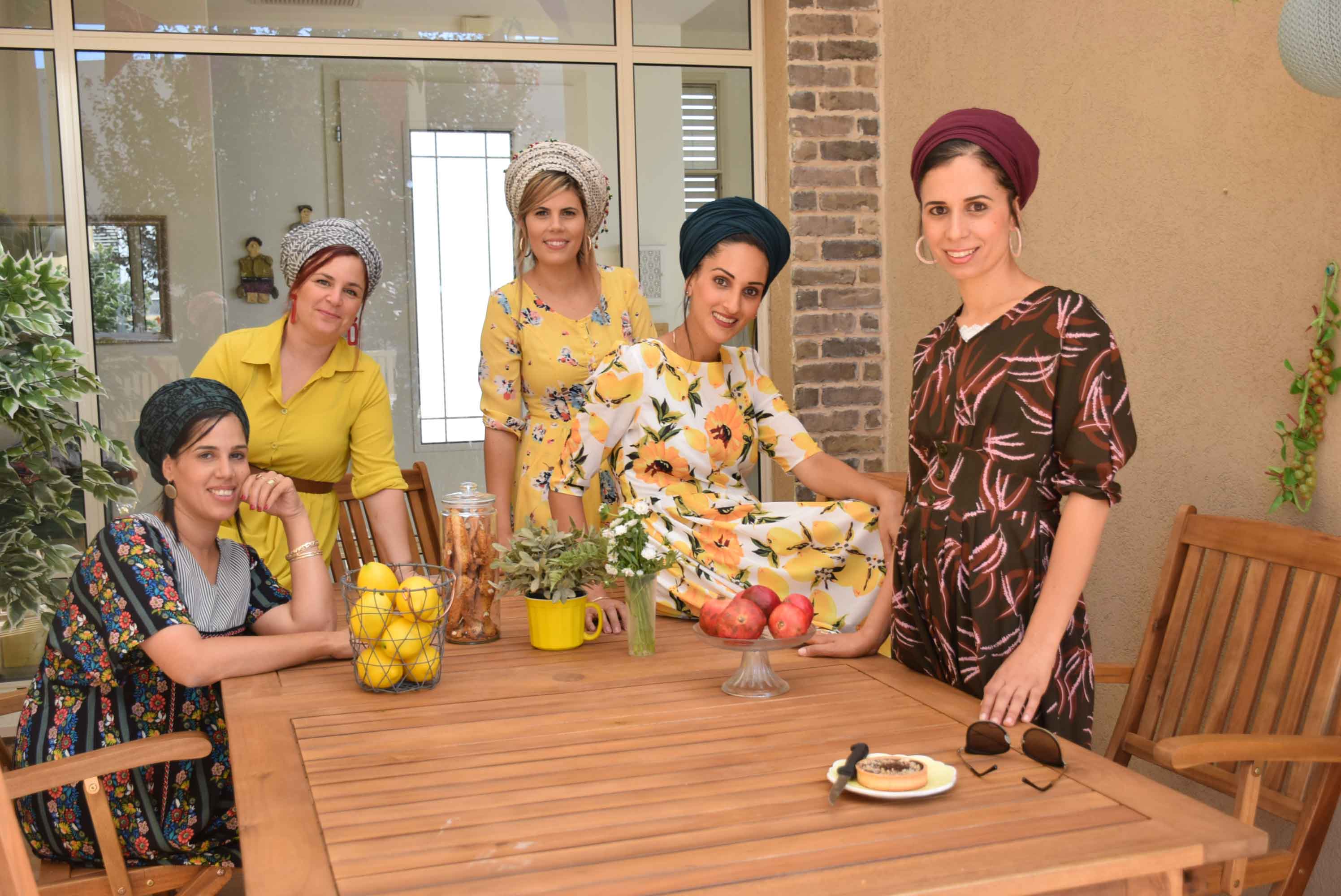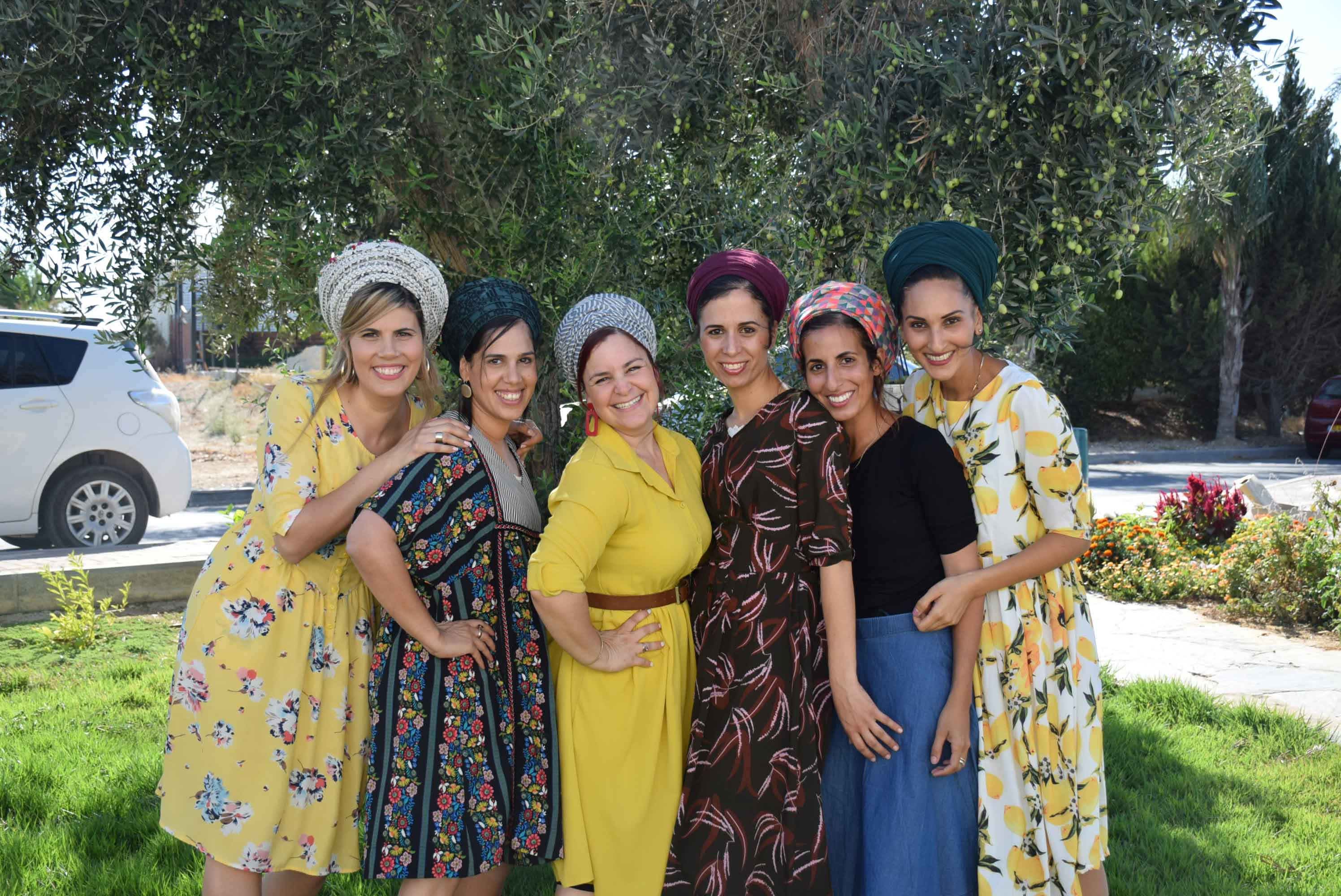 שמלה: רותה, מטפחת: סהר. / שמלה: הדס, מטפחת: נחלת בנימין- אוסף אישי. / שמלה: שדה בר מטפחת: סיילה. / שמלה צהובה: גולדה, מטפחת: נחלת בנימין, עגילים: שדה בר. / שמלה ירוקה: אלי אקספרס, מטפחת: אביה ששון.