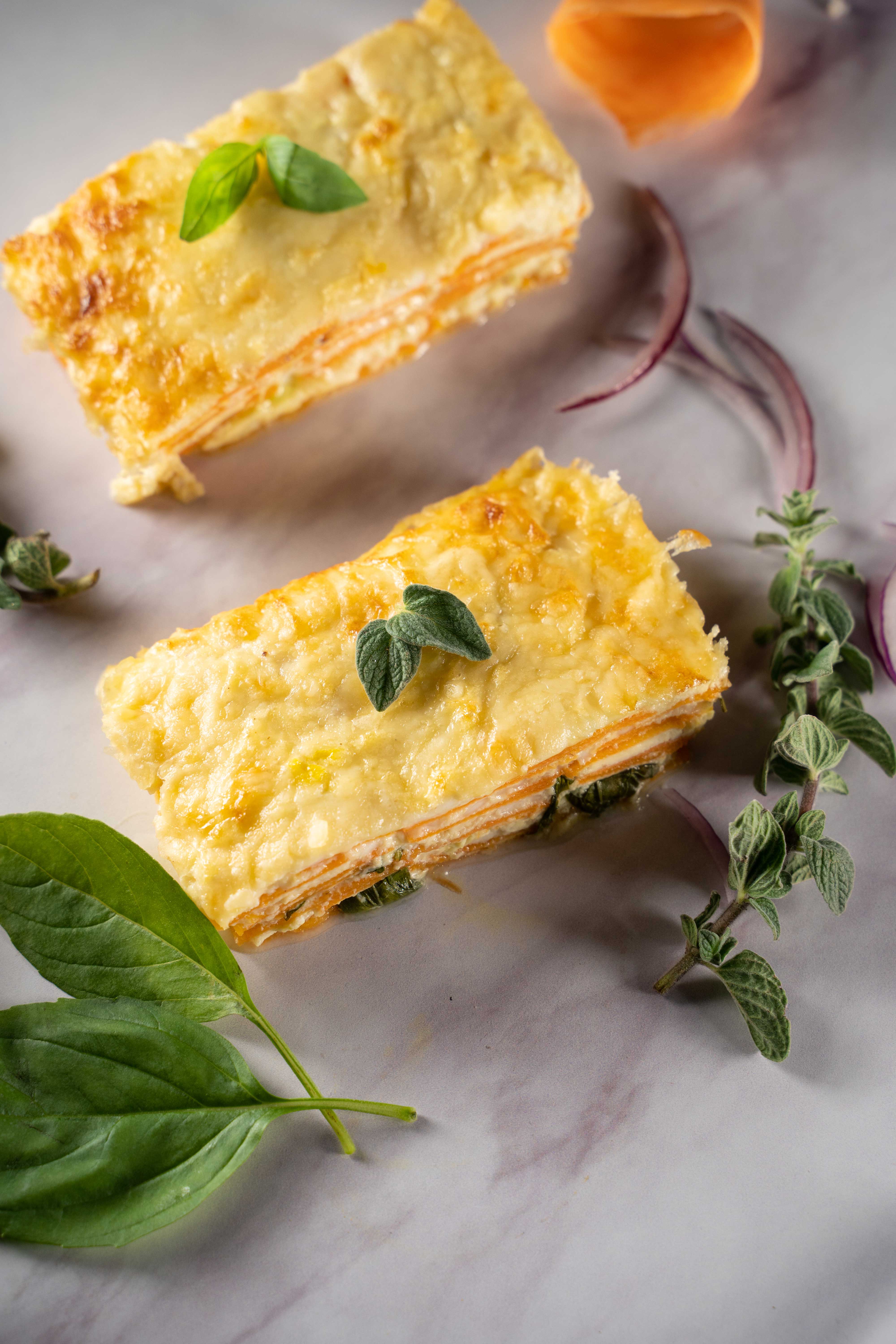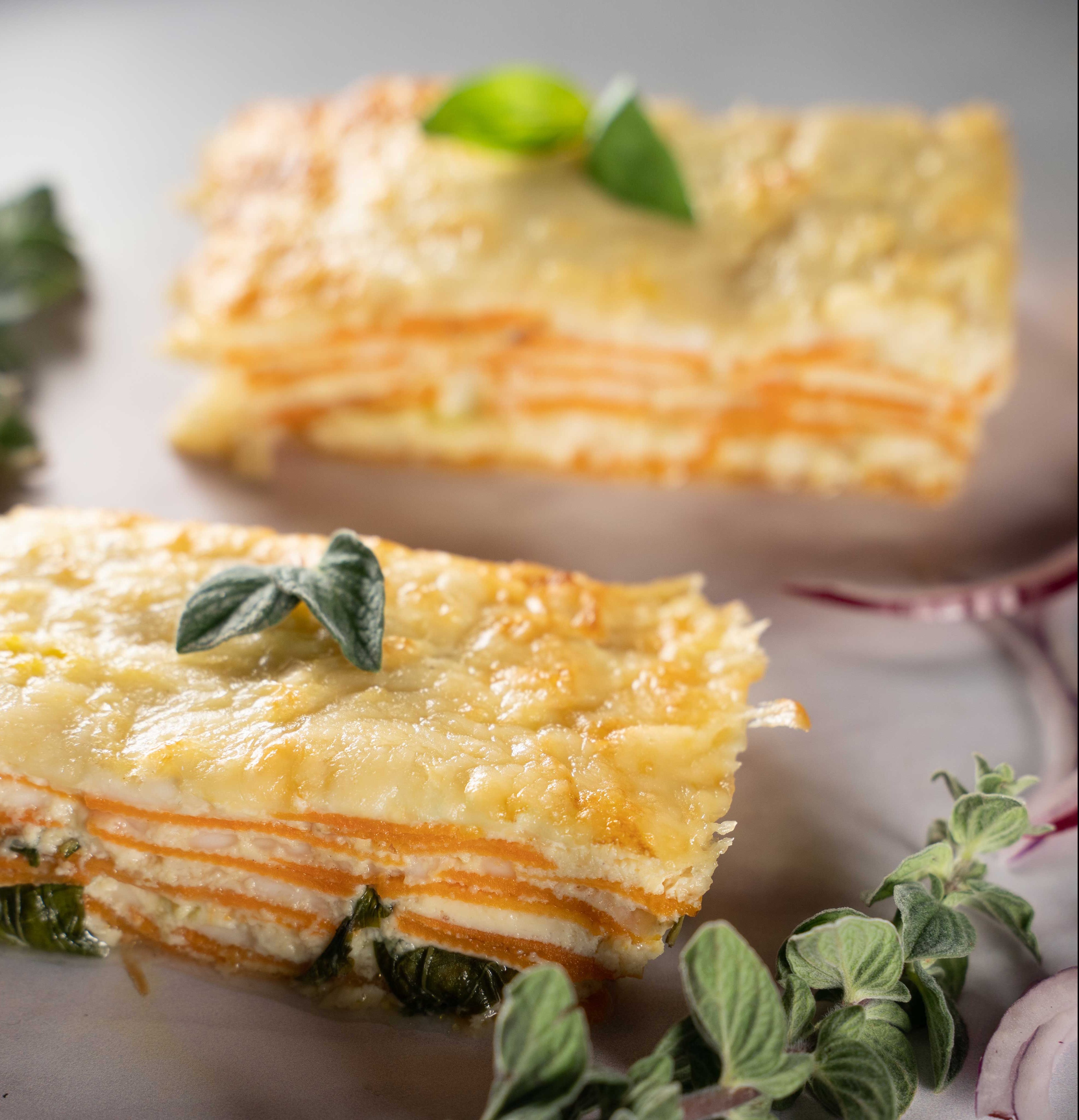 לזניה ללא גלוטן עשירה בגבינות ובמתיקות מעודנת. קבלו את הבטטה בתפקיד חייה