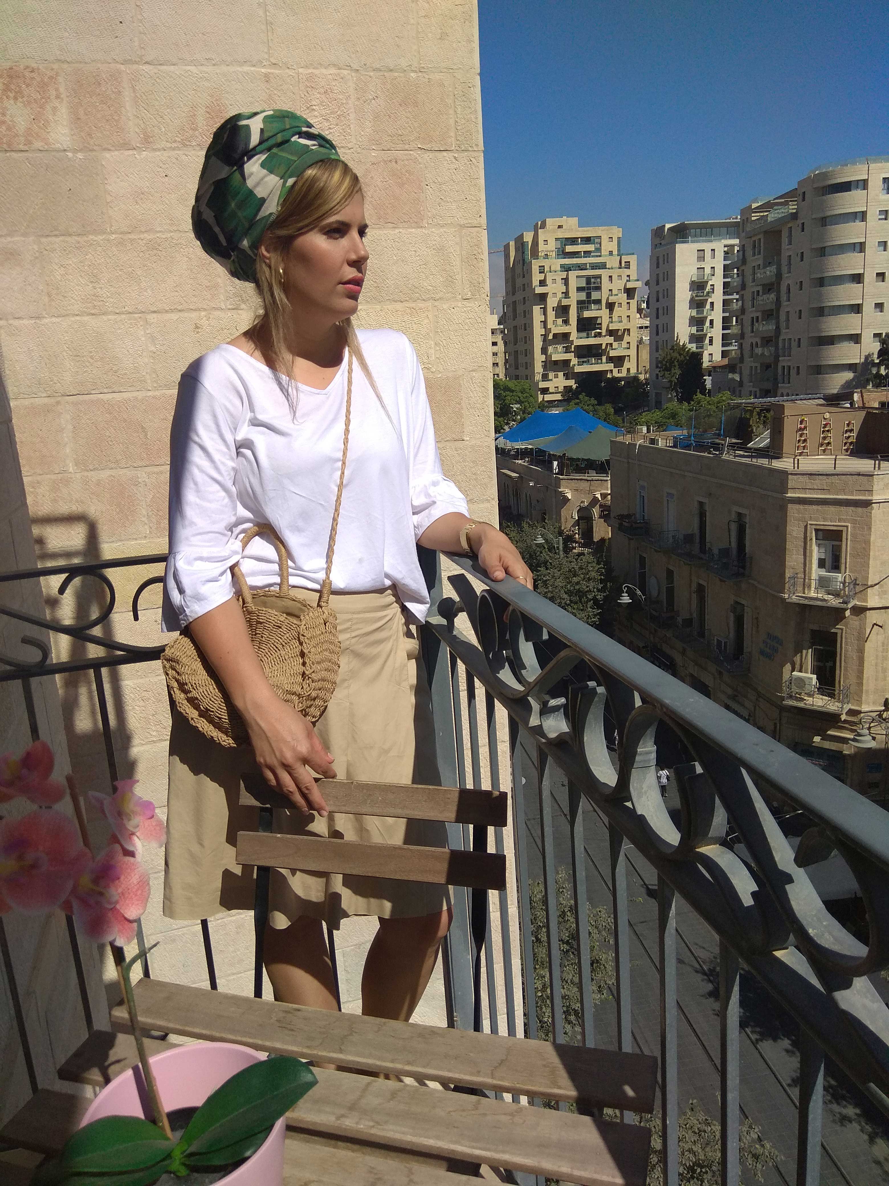 - חולצה- 'גונג' 40 שח. חצאית – גולף. עגילים- 'גונג' 10 שקלים. מטפחת 'סהר עיצוב מטפחות' 100 שקלים .